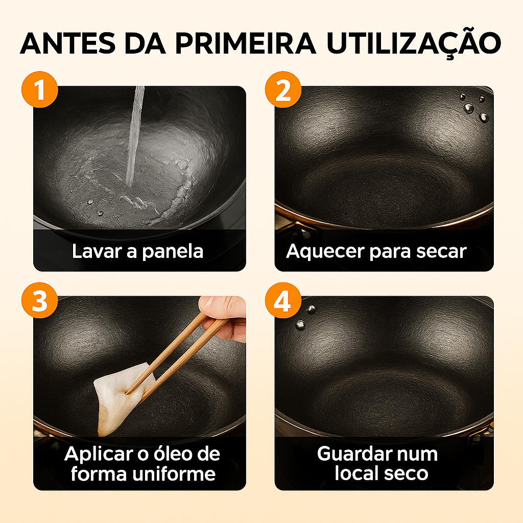 – Antes da primeira utilização, lave, aqueça e aplique uma fina camada de óleo.